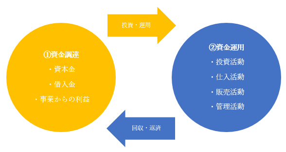 上記の図のように資金を調達し、運用するサイクルを企業は常に繰り返しています。