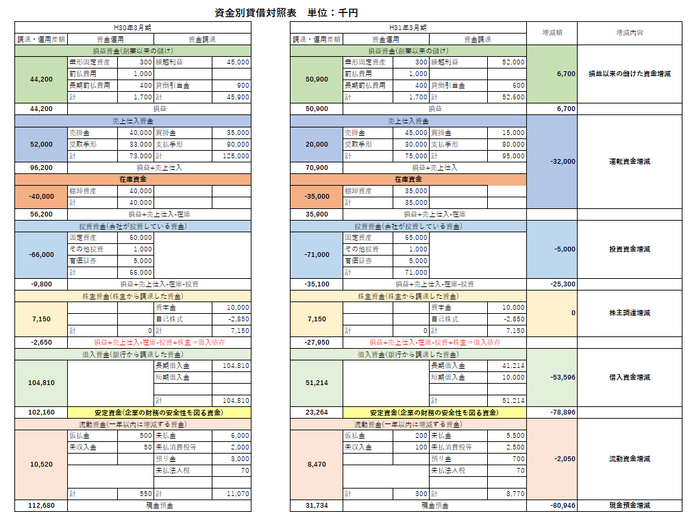 キャッシュフロー損益的な数字の見方、資金別貸借対照表の数字により現状のキャッシュの増減を分析し、