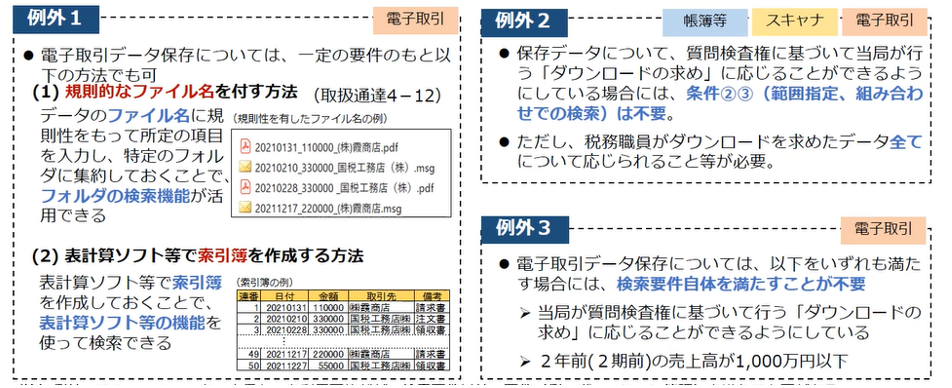 2024年(令和6年)1月1日に施行予定の電子帳簿保存法に対応するには、以下の例外要件に対応するのが一番実務的に手間がかからないと思います。