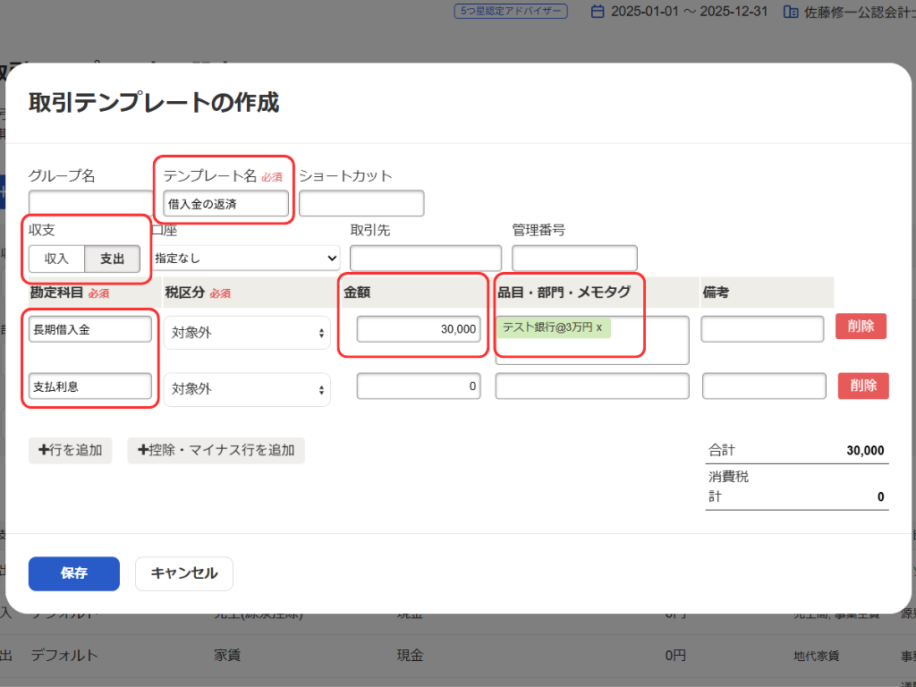 などの場合は金額まで指定した状態で取引テンプレートを作成しておくと、作業が一段階楽になります。