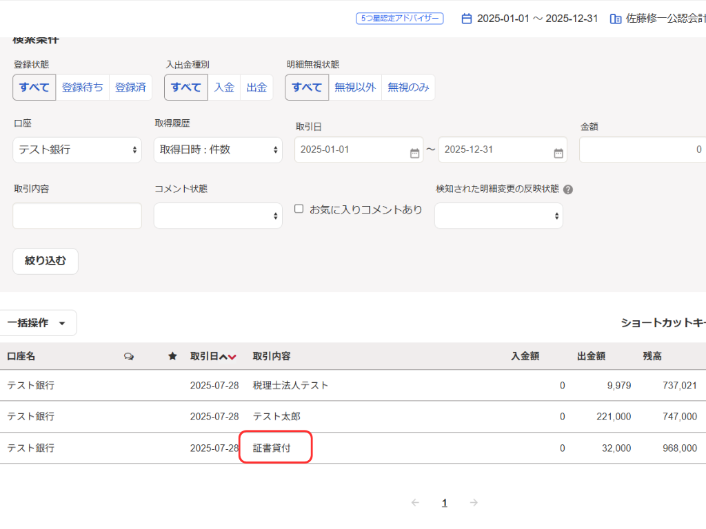 【手順2】対象の取引がなんという摘要で表示されているか確認