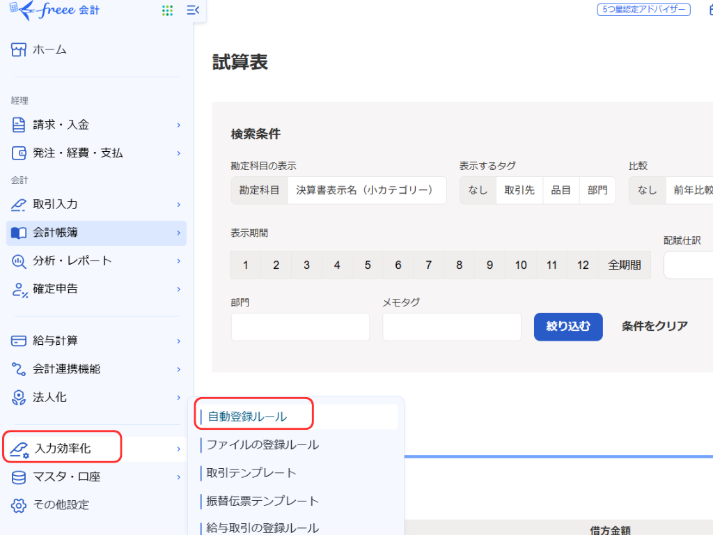 自動登録ルールはfreee会計のトップ画面の左メニュー「入力効率化」から「自動登録ルール」を選択してください。