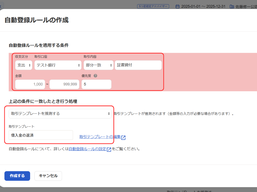 摘要は同じだけど違うルールを適用させたいときは、取引金額で絞り込んで自動登録ルールを作成すれば問題ありません