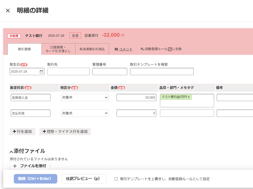 これで設定はすべて完了しましたので、対象の明細をクリックしてから必要項目を入力し、登録するだけでOKです。