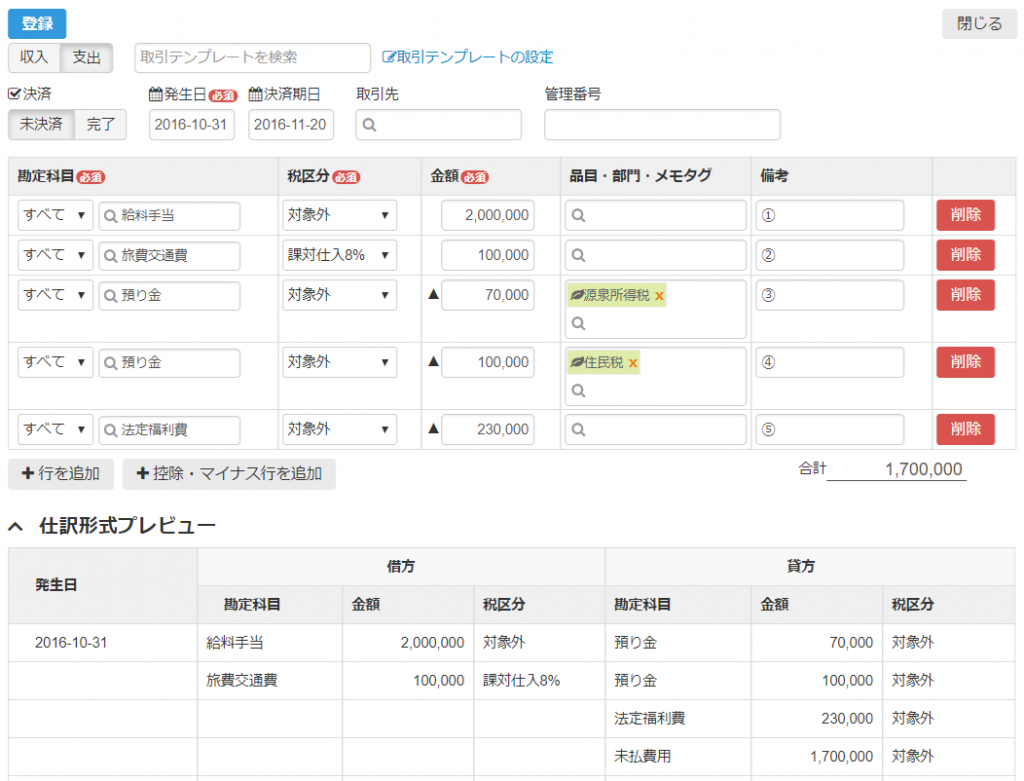 給与の入力は、「取引テンプレート」を使った入力がおすすめです。
