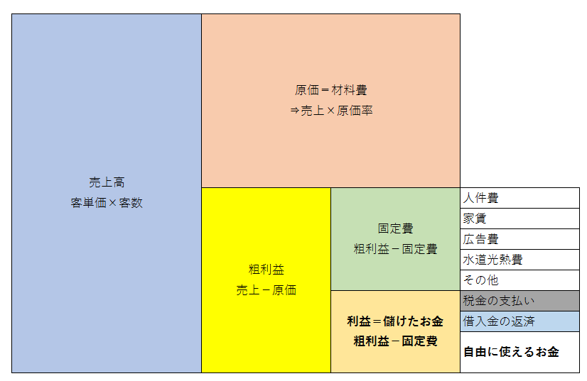 粗利益=客数×客単価×(1-原価率)となります。