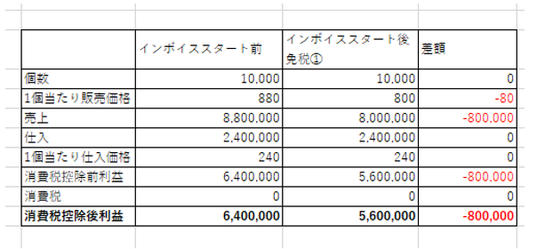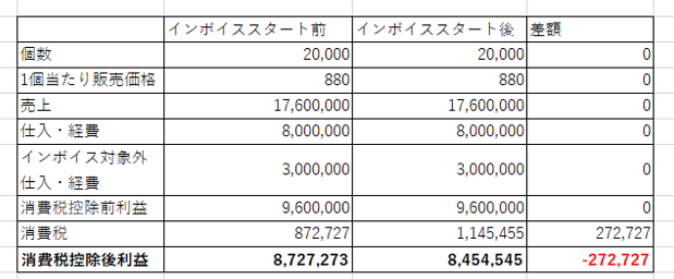 先ほどご説明ように、基本は、インボイスがスタートすることで利益は減少します。