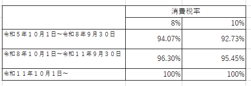 表からは、令和8年9月30日まで、消費税10%の取引では、課税事業者のコスト負担100%とした時、免税事業者のコスト負担は92.73%相当になることを意味しています。