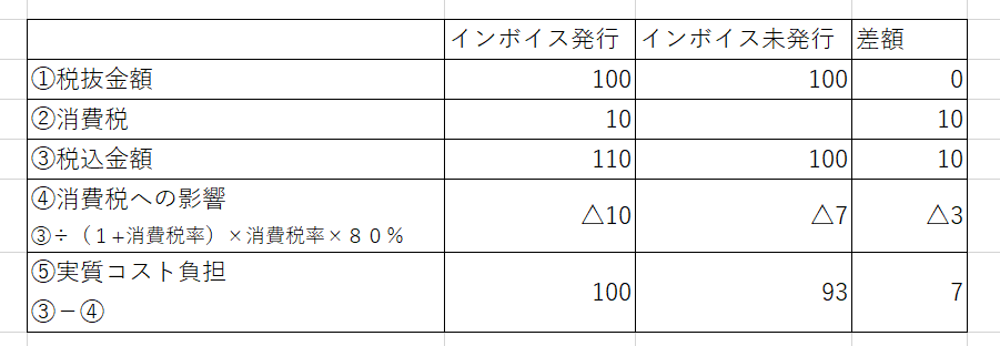 上の表は、課税事業者への支払うコスト負担を100%とした時、免税事業者へ支払うコスト負担が何%相当になるかを表した表です。