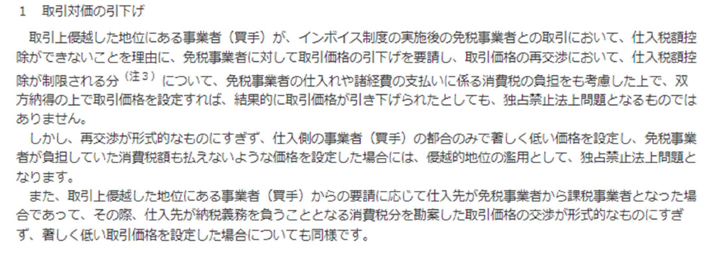 あとは、価格は交渉の下に進めるべきで、以下の公正取引委員会が発表しているインボイス制度がスタートすることによる取引上の強い立場を利用し、価格の引き下げにつながることのないよう注意喚起しています。