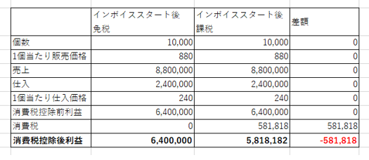 なぜなら、上記の表のように、インボイスを発行し、消費税を納税することで、消費税額相当分の利益が減少するからです。