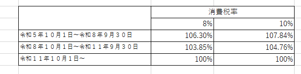 しかし、消費税10%で、免税事業者に対し、課税事業者へのコスト負担が、令和8年10月1日~令和11年9月30日までは、104.76%となりますが、