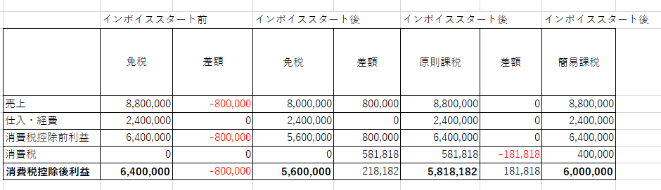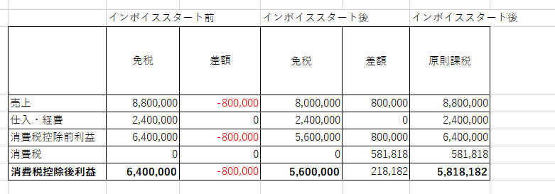 上の表では、インボイススタート前の利益が6,400,000円、インボイスがスタートし、免税のままだと5,600,000円で利益が800,000円減少してしまいます。
