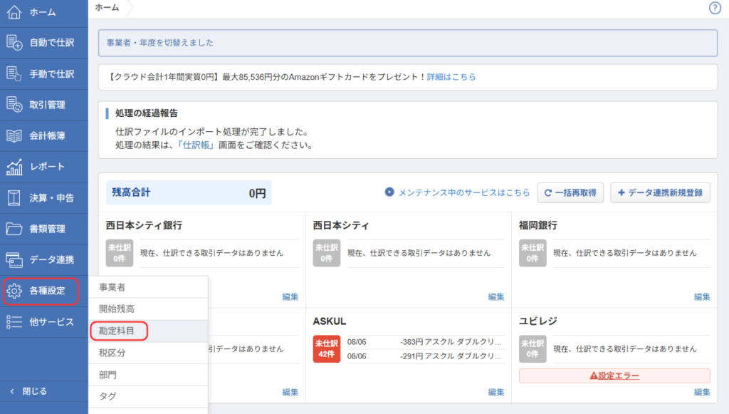 ①「各種設定」⇒「勘定科目」より、勘定科目の作成画面に進みます。