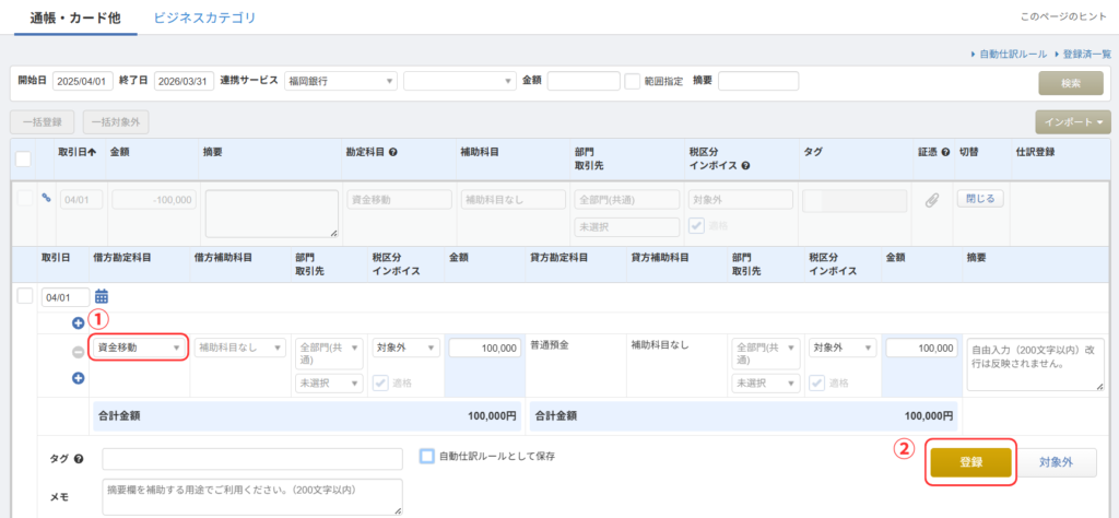 資金移動の明細は「資金移動」という勘定科目で登録する