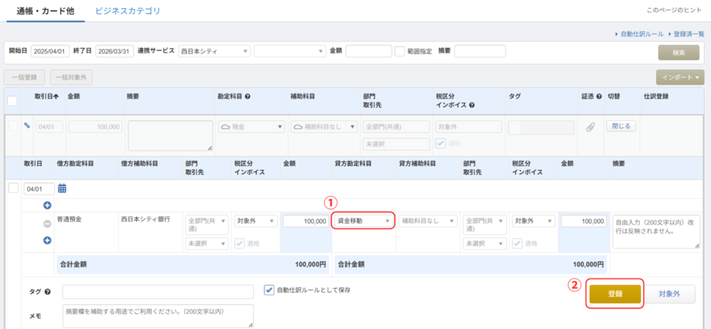 続いて、もう一方の明細(お金が入ってきた西日本シティ銀行側の明細)も同じように「資金移動」勘定で仕訳をします。
