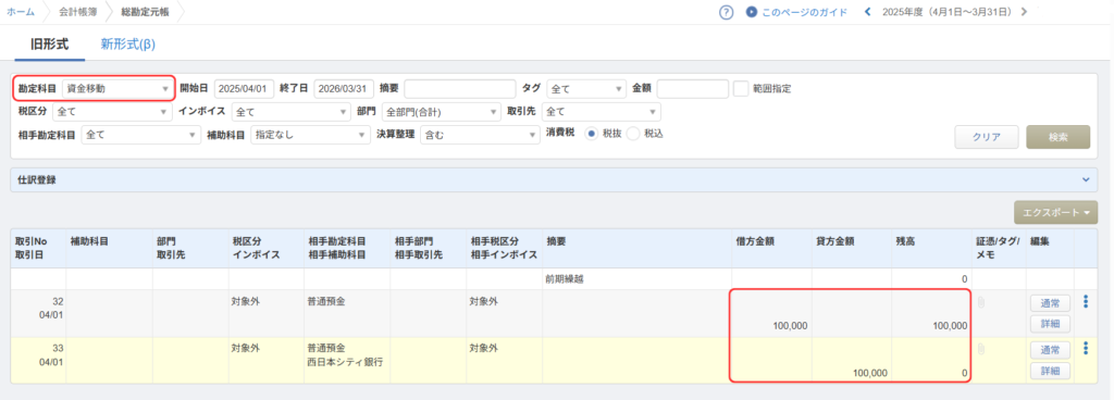 「資金移動」勘定の総勘定元帳を見てみると、福岡銀行から西日本シティ銀行に10万円を移動させた後は残高がゼロになっていることが分かります。