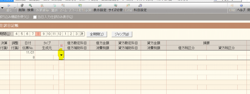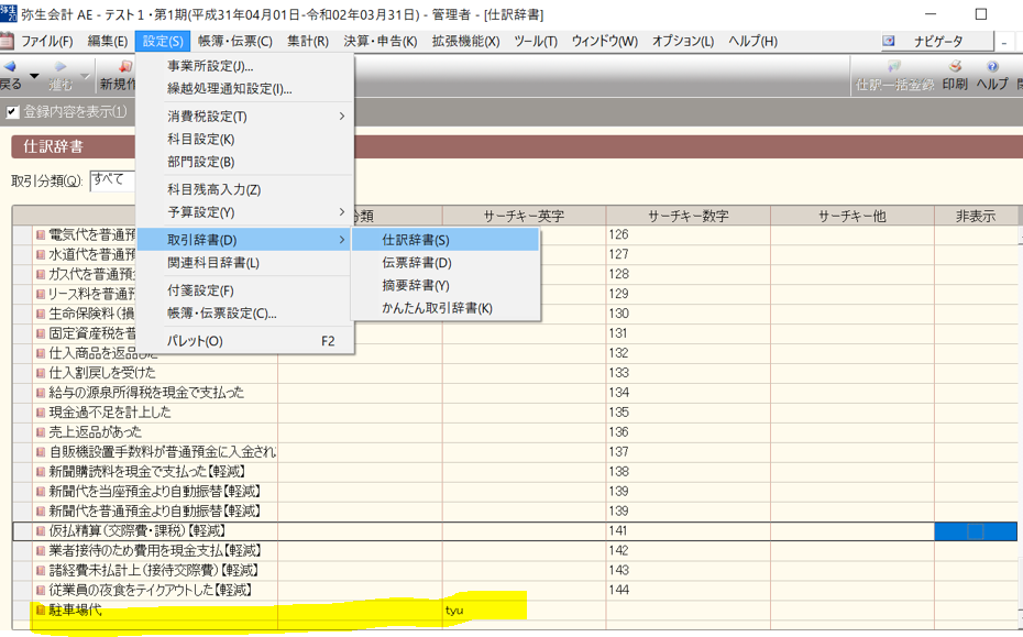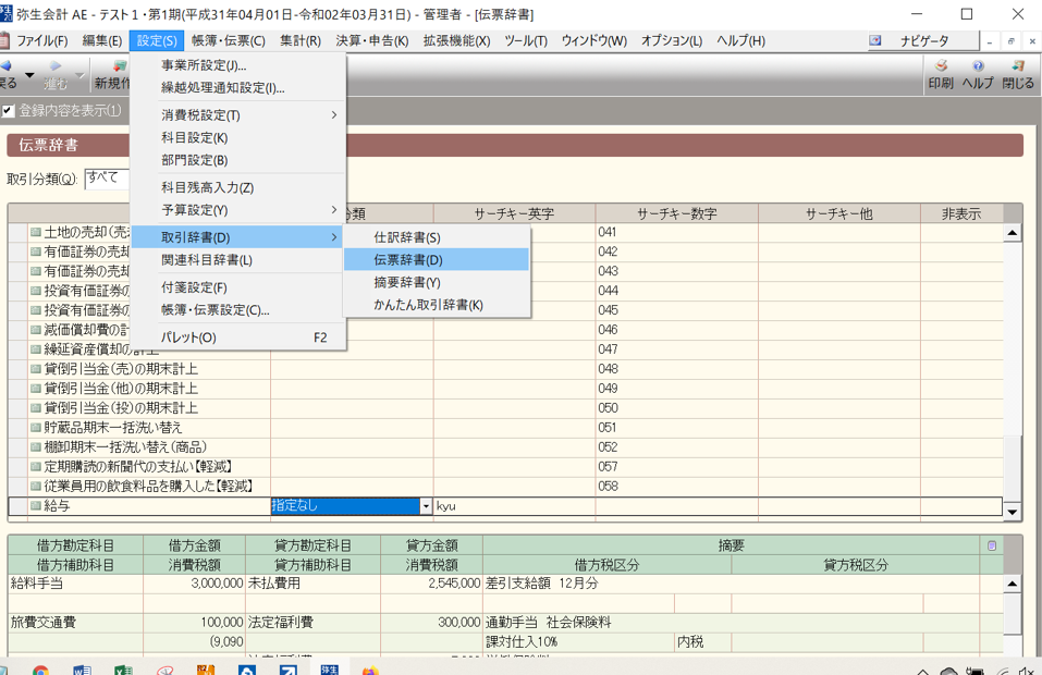 ちなみにここでも弥生会計の初期で入っている伝票辞書の一覧が当画面で表示されています。
