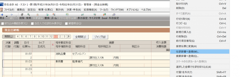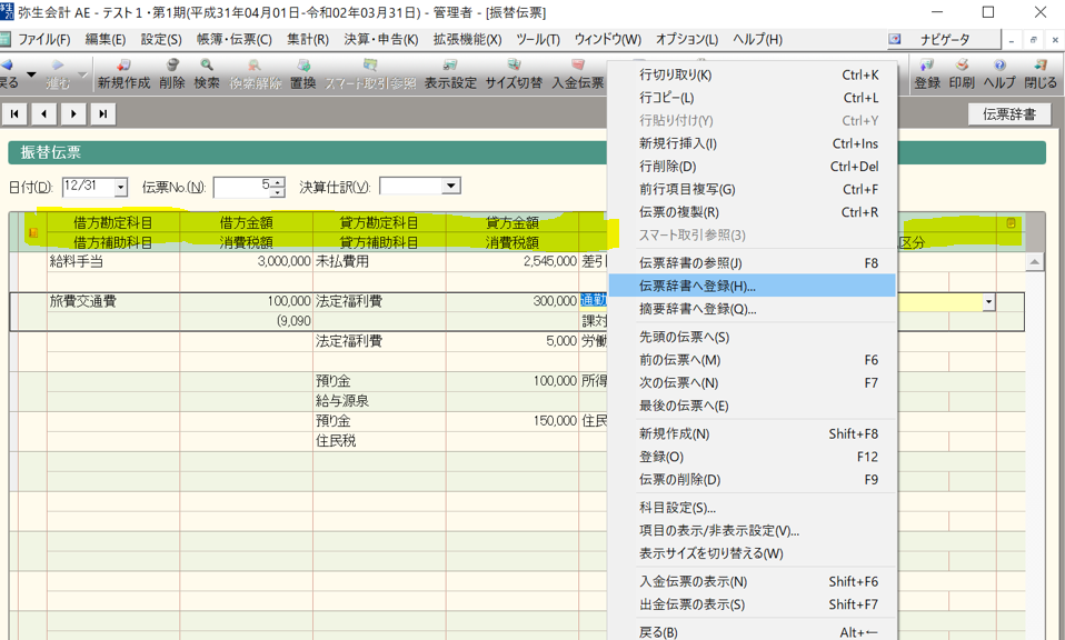 そして、見えずらいですが、日付の入力欄と勘定科目の入力箇所の間の「借方勘定科目や借方金額~摘要」が横に並んでいる濃いグリーンの箇所(黄色のマーカー)で右クリックし、「伝票辞書へ登録」を選択します。