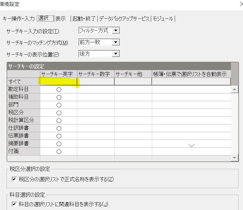 「サーチキー英字」を利用するには、以下の方法で「サーチキー英字」が利用できるよう弥生会計の設定を確認してください。
