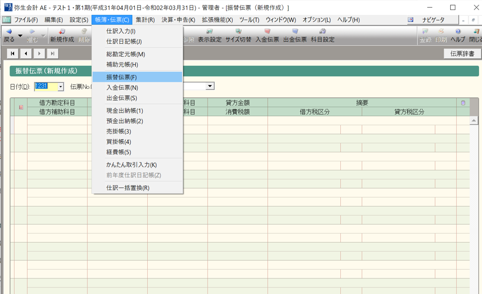 振替伝票は、画面上部のメニューバー「帳簿・伝票」の「振替伝票」を選択します。