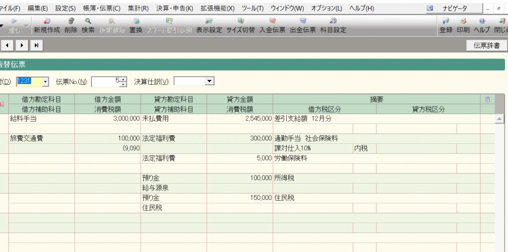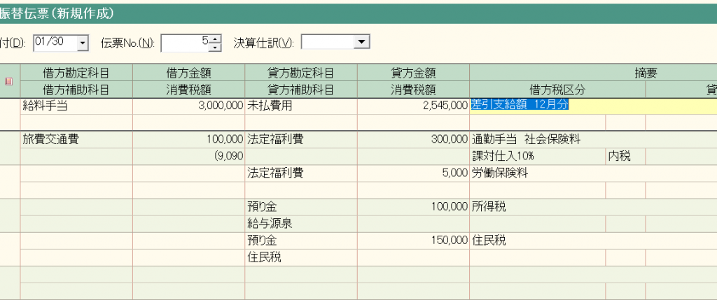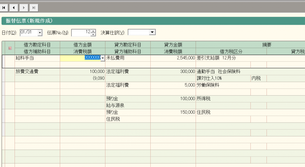 登録した振替伝票と同様の振替伝票が表示されますので、入力の際には、項目の増減がない限り、登録月の支給一覧表などの資料を見ながら入力すると入力しやすく、金額の変更箇所のみを入力すれば入力完了です。