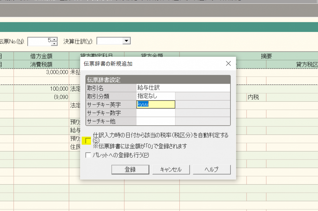 ここでは「サーチキー英字」を「kyuu」として、「仕訳の入力時の日付から該当の税率(税区分)を自動判定する」(黄色の箇所)のチェックを外し、「登録」をクリックして完了です。