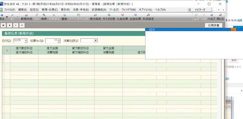 通常通り、振替伝票の新規作成画面に入り、画面右上の閉じるボタンの下の「伝票辞書」で先ほど「サーチキー英字」に登録した「kyuu」を入力すると以下のように絞り込まれるのでエンターキー又はTabを押すと