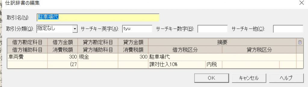 例えば、上記の300円の駐車場代を仕訳辞書登録してみます。