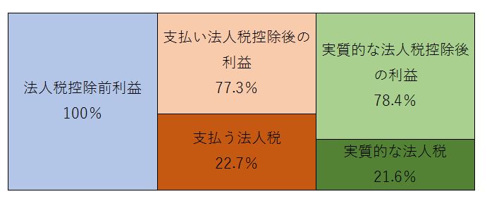 法人税を控除した後、実質的に内部留保できる割合は、100%-支払税率22.7%=77.3%ではなく、100%-実効税率21.6%=78.4%になることを意味します。